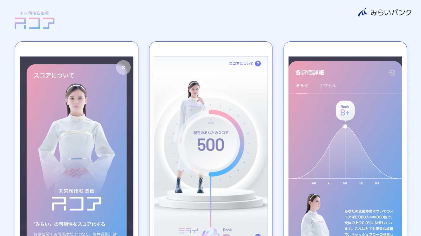 「みらいツール」は、みらいバンクのお客さまに向けた金融にまつわるコンテンツサービスで、「カプセル」「ミライ」「スコア」の3つで構成されます。