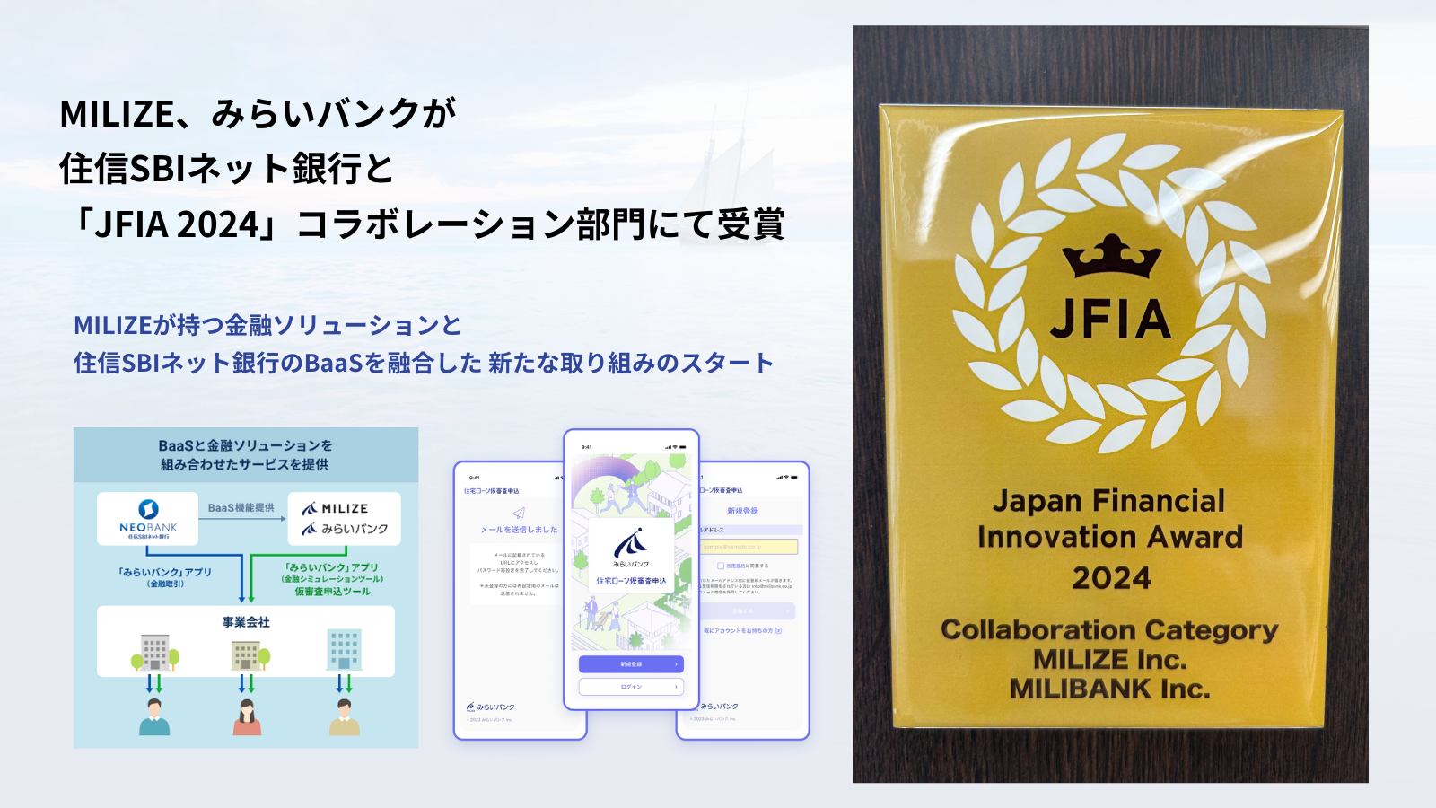 株式会社みらいバンク(本社:東京都港区、代表取締役社長:秋本 和俊、以下「みらいバンク」)と株式会社MILIZE(本社:東京都港区、代表取締役社長:田中 徹、以下「MILIZE」)は、住信SBIネット銀行株式会社(本社:東京都港区、代表取締役社長(CEO):円山 法昭、以下「住信SBIネット銀行」)と、金融イノベーションの取組みを表彰する「Japan Financial Innovation Award 2024(以下「JFIA2024」)」において、コラボレーション部門で受賞しました。