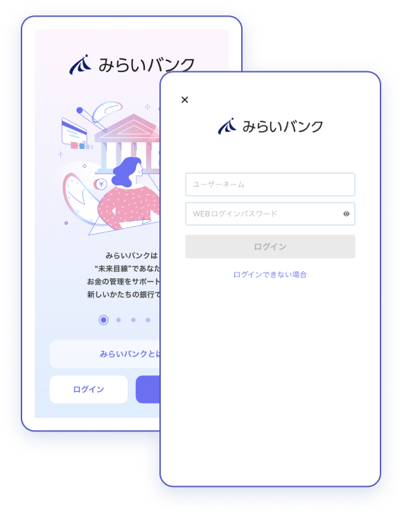口座開設後、初期設定が完了するとアプリ「みらいバンク」から各種銀行取引がご利用できます。