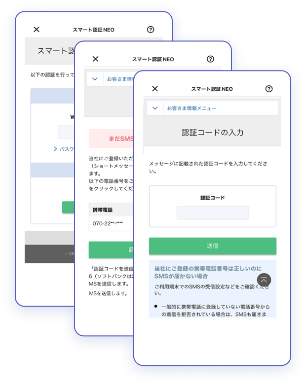 - WEB取引パスワードとSMSで認証を実施。