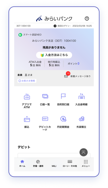 - スマート認証NEOの登録が完了し、「みらいバンク」のトップ画面に遷移します。