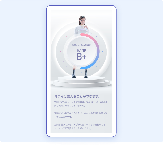 また、入力いただいたデータを元に、みらいバンクの次世代金融アドバイザー「MiLi」があなたのことを学習。今後の適切なアドバイスをお届けし、また、みらいバンク独自の「スコア」としてあなたの信用データを可視化することが可能です。