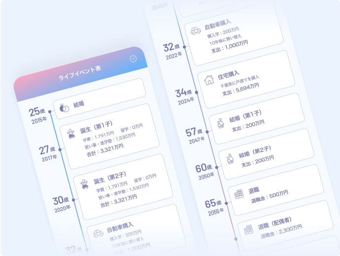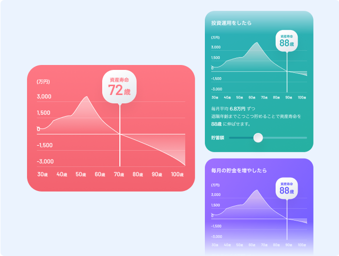 お客様の収入・支出・ご家族・ライフプランに応じて、将来の資産の寿命を試算します。現在の支出や、契約している金融サービスの見直し、預貯金・積立投資等の運用方法の変更などによる、豊かな暮らしへのアドバイスを提供します。